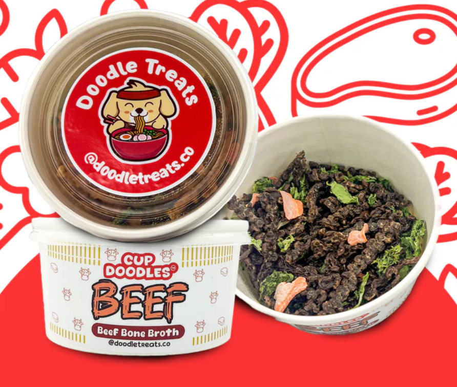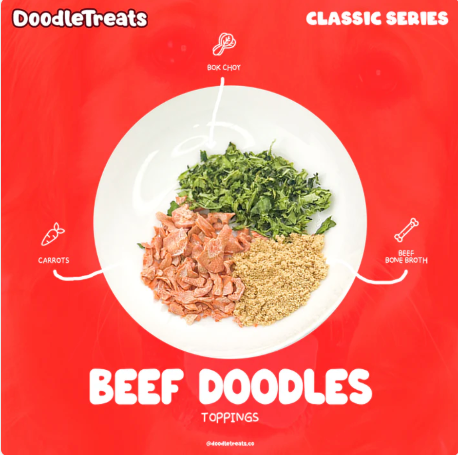 "Each bowl is topped with beef bone broth, bok choy and carrots, adding a burst of flavor without sacrificing nutrition to your dog's new favorite treat. These natural toppings not only enhance the overall taste, but also contributes to your dog's well-being.