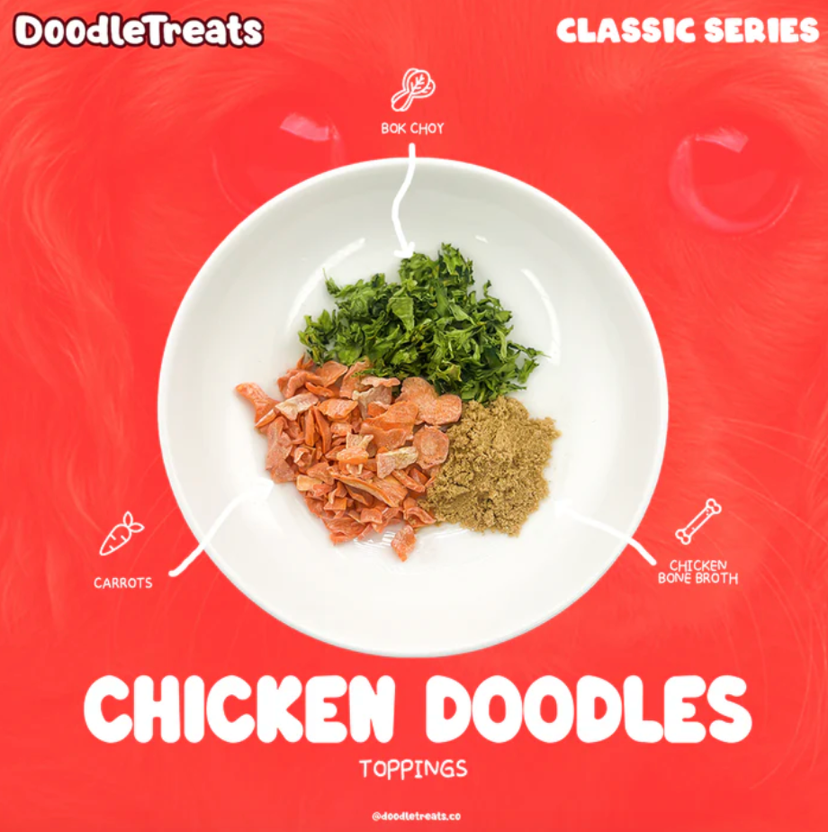 "Each bowl is topped with chicken bone broth, bok choy and carrots, adding a burst of flavor without sacrificing nutrition to your dog's new favorite treat. These natural toppings not only enhance the overall taste, but contributes to your dog's well-being.